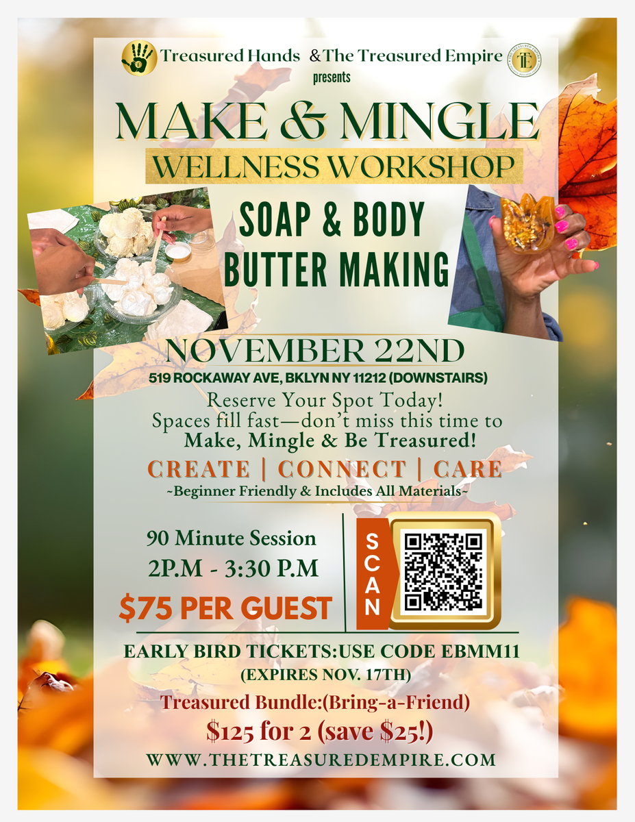 Join us for a hands-on wellness experience where creativity meets calm. In this relaxing session, you’ll craft your own signature soap and whipped body butter using natural, skin-loving ingredients. Mix, blend, and create as you explore nourishing oils, soothing botanicals, and the art of self-care. Perfect for friends, couples, or a little “me-time,” this Make & Mingle workshop invites you to unwind, have fun, and take home your Treasured creations!